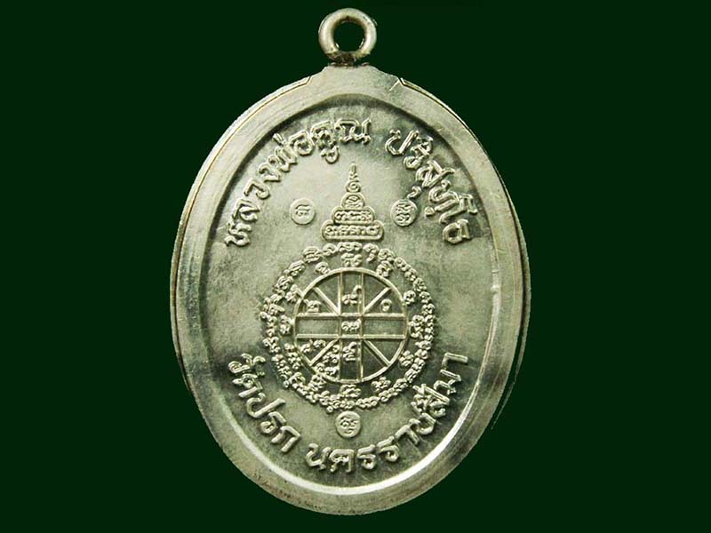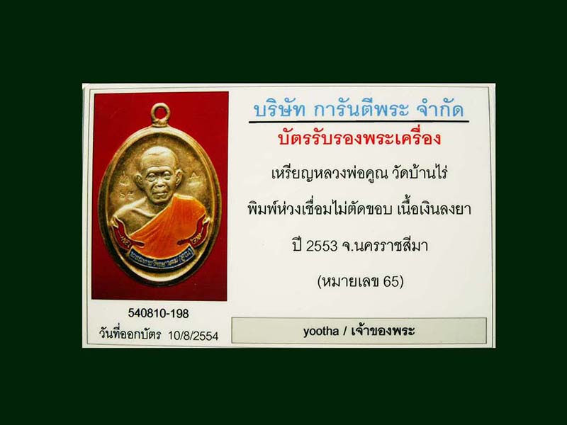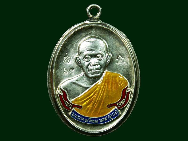 เหรียญหลวงพ่อคูณ วัดบ้านไร่ พิมพ์ห่วงเชื่อมไม่ตัดขอบ เนื้อเงินลงยา ปี 2553 จ,นครราชสีมา (หมายเลข 65)