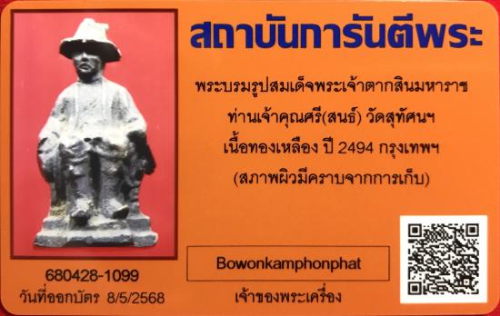 พระเจ้าตากสินมหาราช ท่านเจ้าคุณศรี(สนธ์) วัดสุทัศนฯ 2494 เนื้อทองเหลือง กรุงเทพฯ