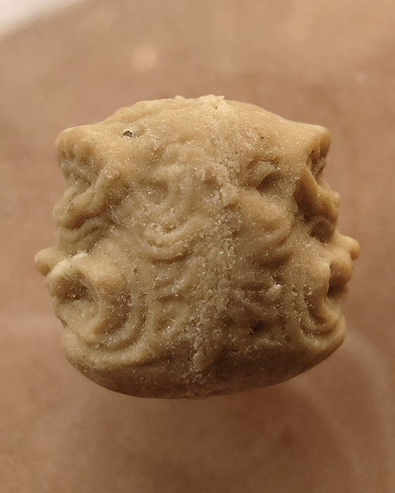 นอกจากพ่อจะบรรจุสีผึ้งวันแห่งความรักลงตลับแล้ว พ่อยังลงมือกดนำฤกษ์เม็ดลูกประคำคอรูปหน้าโขนองค์พระพิราพขึ้นอีก เพื่อให้สมความตั้งใจที่คิดไว้ในอดีต