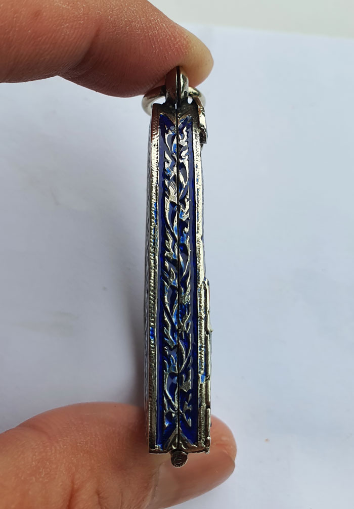 ตลับเงินยกซุ้มลงยา สภาพดีเหมือนใหม่ ใส่พระหลวงปู่ทวด พิมพ์เตารีดใหญ่ พระกริ่งใหญ่ และเกจิอื่นๆขนาดใกล้เคียง ขนาด 2.4x3.9 ซม. สวยสมบูรณ์ |
