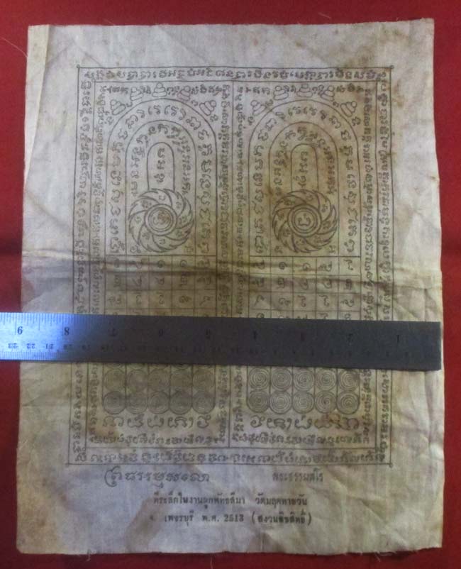 ผ้ายันต์ ที่ระลึกในงานผูกพัทธสีมา วัดมฤคทายวัน จ.เพชรบุรี พ.ศ. 2513 ครับ (พระบ้าน ครับ) |