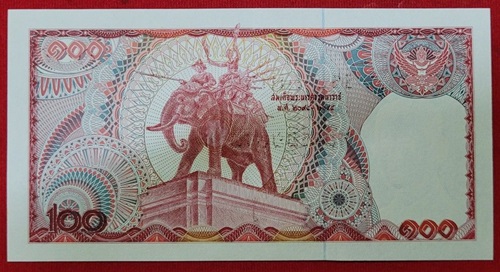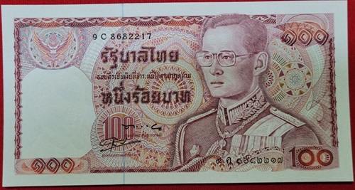 ธนบัตร 100บาท ร.9 แบบ 12 หลังช้างแดง หมายเลข 9C 8682218 - ๙ค ๘๖๘๒๒๑๘ ลายเซ็น ประมวล - กำจร สภาพ UNC