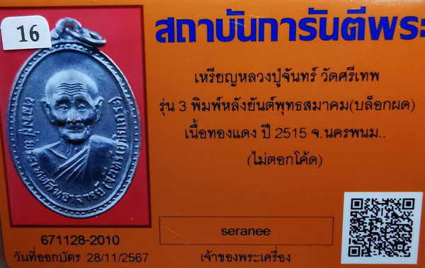 เหรียญหลวงปู่จันทร์ วัดศรีเทพ รุ่น3 พิมพ์หลังยันต์พุทธสมาคม(บล๊อคผด) เนื้อทองแดง (ไม่ตอกโค้ต) ห่วงเดิม ปี2515 จ.นครพนม + บัตรG-pra สภาพสวยเดิมค่ะ |