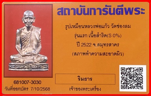 รูปเหมือนหลวงพ่อแก้ว วัดช่องลม รุ่นแรก เนื้อสำริด ปี2522 มีบัตรรับรองจีพระ เคาะเดียว