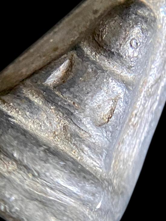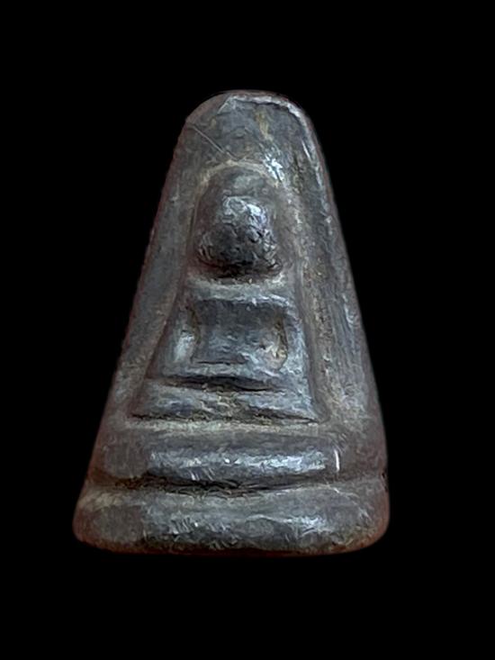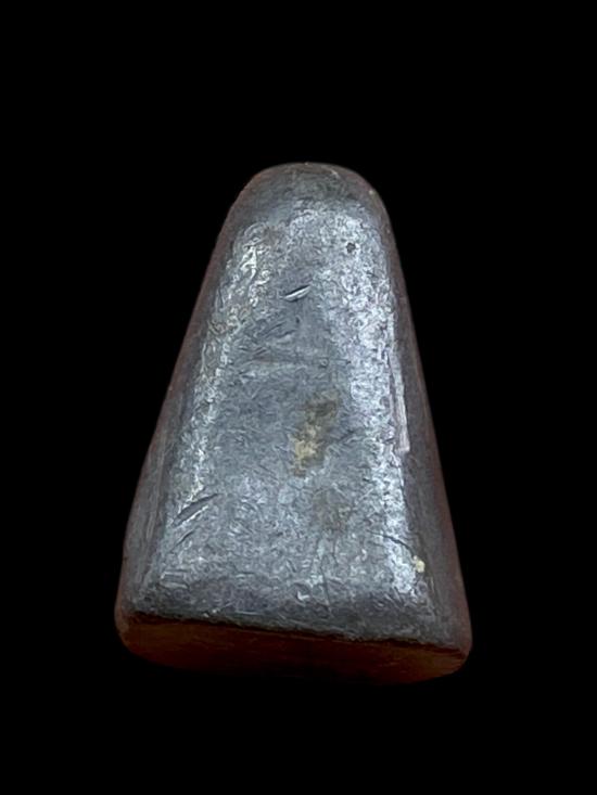 ***องค์นี้เนื้อตะกั่วเก่าจัดมาก ผิวแห้งแน่น มีรอยคราบสนิมตะกั่วขึ้นตามอายุธรรมชาติ ไม่มีการแต่งผิวหรือขัดใด ๆ พิมพ์ทรงโบราณแบบนั่งสมาธิสามเหลี่ยม เนื้อแน่นจัด หนักมือดูง่าย