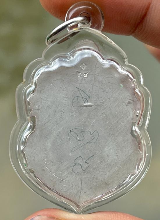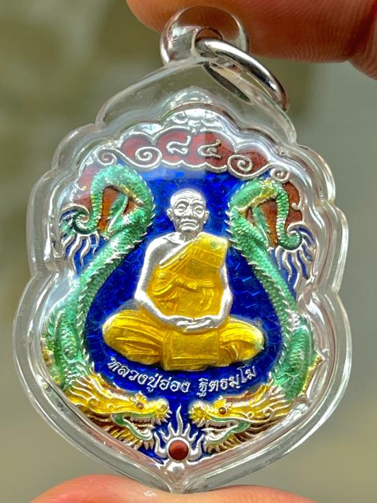 เสมามังกรคู่ หลวงปู่อ่อง ฐิตธมโม เนื้อเงินลงยาน้ำเงิน หลังเรียบมีรอยจาร เลข24 พร้อมเลี่ยม