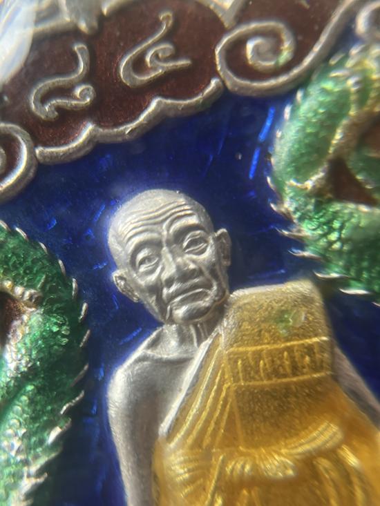 เสมามังกรคู่ หลวงปู่อ่อง ฐิตธมโม เนื้อเงินลงยาน้ำเงิน |