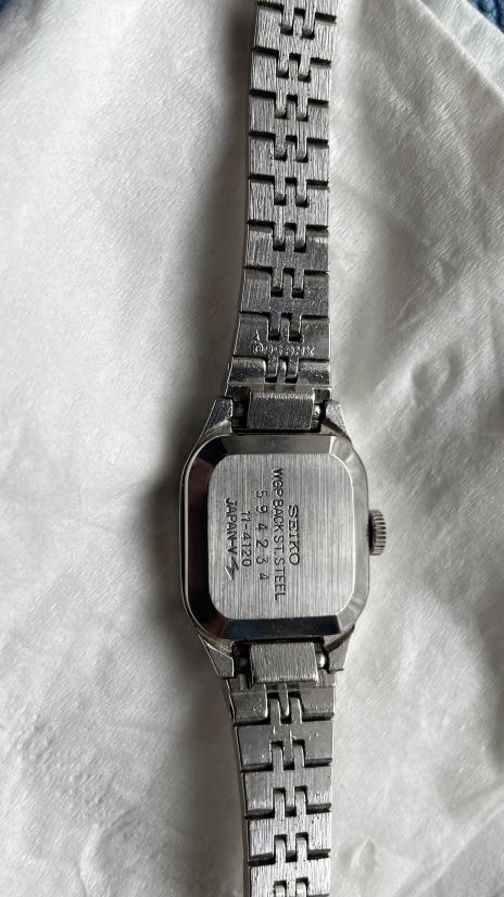 นาฬิกาผู้หญิง Seiko ทรงเหลี่ยม 17 jewels ระบบไขลาน ขนาด 18 มม.(ไม่รวมเม็ดมะยม) หน้าปัดสีน้ำเงินลายหินอ่อน หลักขีด ตัวเรือนชุบทองคำขาว มาพร้อมสายสแตนเลสตีตรา seiko ความยาวสายรอบข้อมือ 18 ซม. สภาพสวยมาก เดินดี เดินปกติ ค่อนข้างเที่ยงตรง |