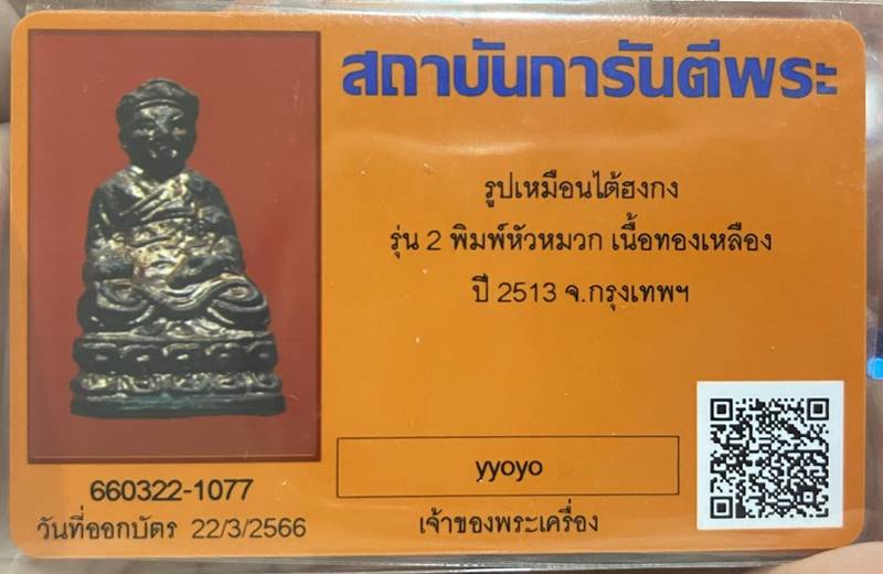 รูปเหมือนไต้ฮงกง รุ่น 2 เนื้อทองเหลือง ปี 2513 หัวหมวกนิยม พร้อมบัตรรับรองครับ องค์ที่ 2