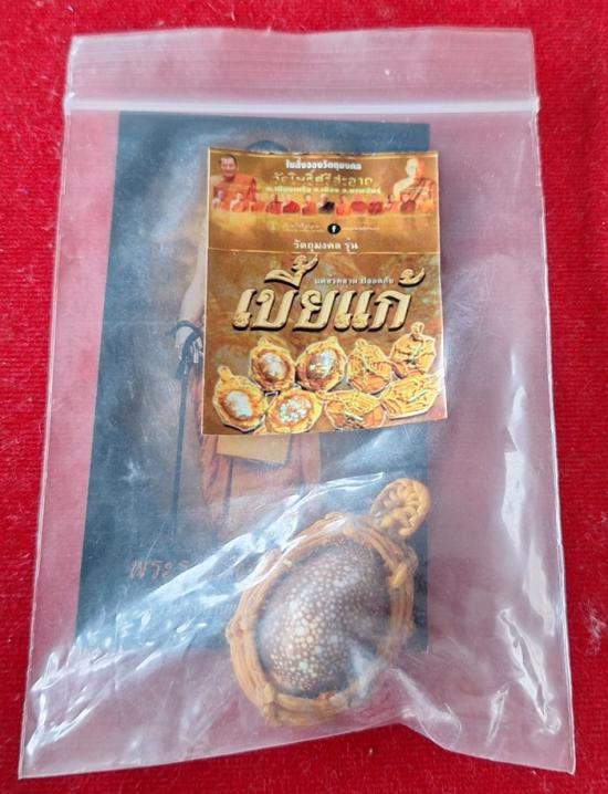 เบี้ยแก้ หุ้มจีวร ถักเชือก หลวงปู่ศิลา วัดโพธิ์ศรีสะอาด มีแผ่นเลขกำกับ ฝังตะกรุดทองเหลือง พร้อมใบคาถา ปี2567 |
