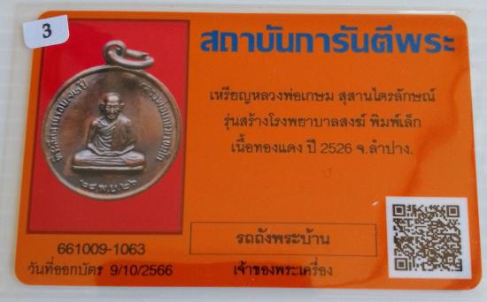 เหรียญหลวงพ่อเกษม สุสานไตรลักษณ์ รุ่นสร้างโรงพยาบาลสงฆ์ พิมพ์เล็ก เนื้อทองแดง ปี 2526 จังหวัดลำปาง พร้อมบัตรรับรองจากสถาบันการันตีพระ |