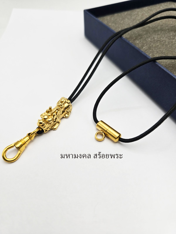 สร้อยเชือกร่มแต่งด้วย ปี๊เซียะทองเลเซอร์ พร้อมก้ามปูสปริง สำหรับแขวนพระ 2 องค์ ยาว 24 นิ้ว |
