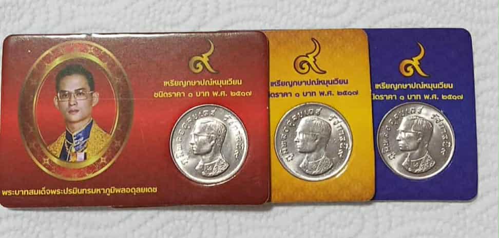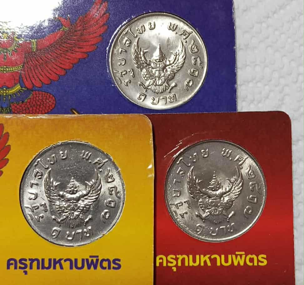 เหรียญ 1 บาท หลังครุฑ พ.ศ.2517 ในสมัย รัชกาลที่ 9 พร้อมการ์ดสีแดง,สีน้ำเงิน,สีเหลือง พกติดตัวไว้เป็นมงคล เหรียญสภาพไม่ผ่านการใช้งาน จำนวน 3 เหรียญ ครับ