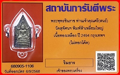 พระพุทธชินราช ท่านเจ้าคุณศรี(สนธ์) วัดสุทัศนฯ พิมพ์ห้าเหลี่ยมใหญ่ เนื้อทองเหลือง ปี2494 มีบัตรรับรองจีพระ เคาะเดียว(แกะจากเลี่ยมพลาสติกใส่ตลับตัด)