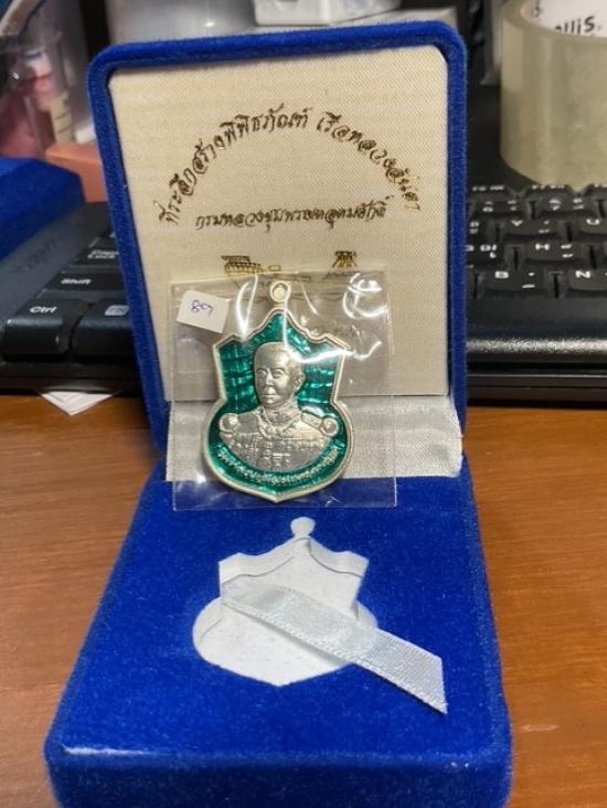กรมหลวงชุมพรฯ รุ่นที่ระลึกสร้างพิพิธภัณฑ์เรือหลวงลันตา เหรียญเนื้อเงินลงยาสีฟ้าน้ำทะเล หมายเลข 89 มาพร้อมกลองเดิมๆครับ