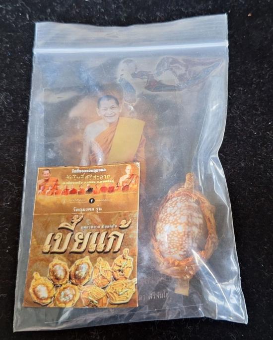 เบี้ยแก้ หุ้มจีวร ถักเชือก หลวงปู่ศิลา วัดโพธิ์ศรีสะอาด มีแผ่นเลขกำกับ ฝังตะกรุดทองเหลือง พร้อมใบคาถา ปี2567 |