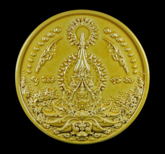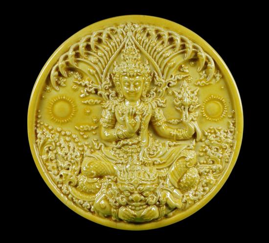| รายละเอียด | พระเทวราชโพธิสัตว์ จตุคามรามเทพ อภิปัญญามหาเศรษฐี ผู้มีปัญญาประดุจดั่งมีทรัพย์ โดยมูลนิธิศิลปกรรม พ.ศ. 2550 (พุทธศิลป์รูปแบบของ อาจารย์เฉลิมชัย โฆษิตพิพัฒน์) ลูกเคลือบสีเหลือง ขนาด 5 cm. สภาพสมบูรณ์ ไม่มีตำหนิ พร้อมกล่องเดิม |