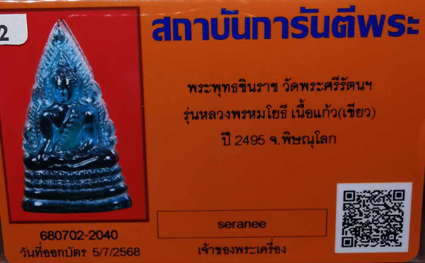 พระพุทธชินราช วัดพระศรีรัตนฯ รุ่นหลวงพรหมโยธี เนื้อแก้ว(เขียว) ปี2495 จ.พิษณุโลก + บัตร G-pra สภาพเดิมค่ะ สภาพตามรูปทุกประการค่ะ