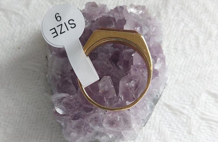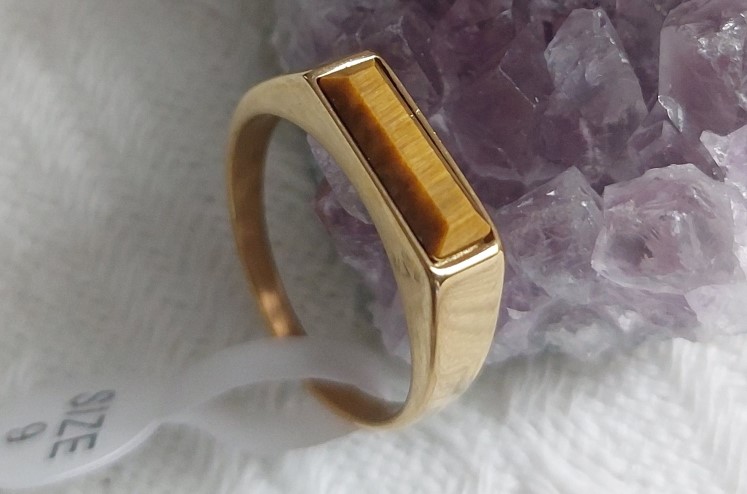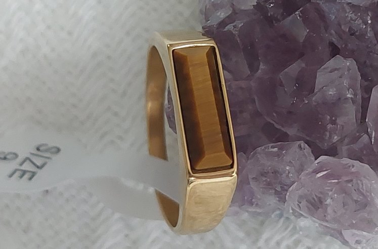 แหวนหัวไทเกอร์อายหรือหินตาเสือ ตัวเรือนแหวนเป็นสแตนเลสงานเลเซอร์ทองแข็งแรงทนทาน ขนาดแหวนเบอร์9