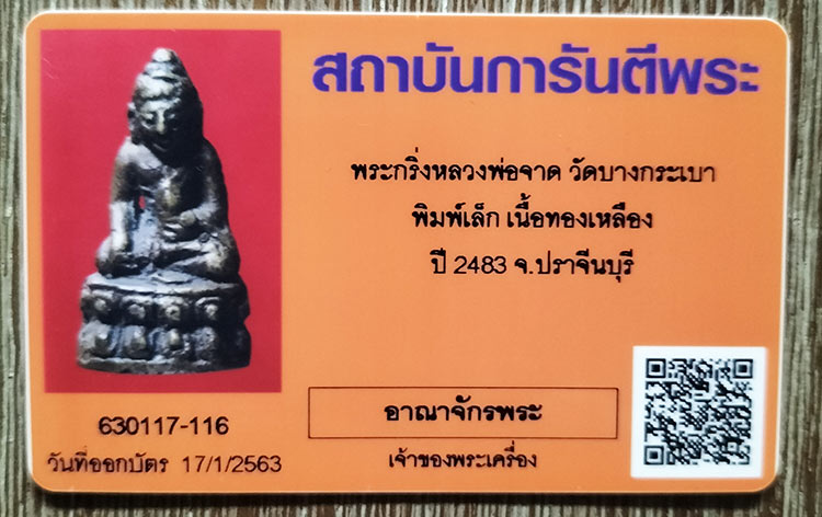 พระกริ่ง หลวงพ่อจาด วัดบางกระเบา พิมพ์เล็ก เนื้อทองเหลือง ปี 2483 จ.ปราจีนบุรี สภาพสวย พร้อมบัตรรับรอง