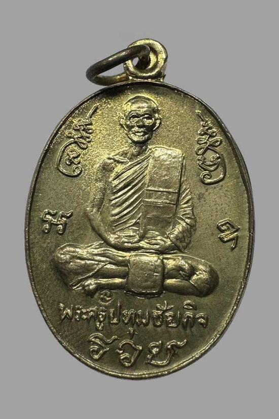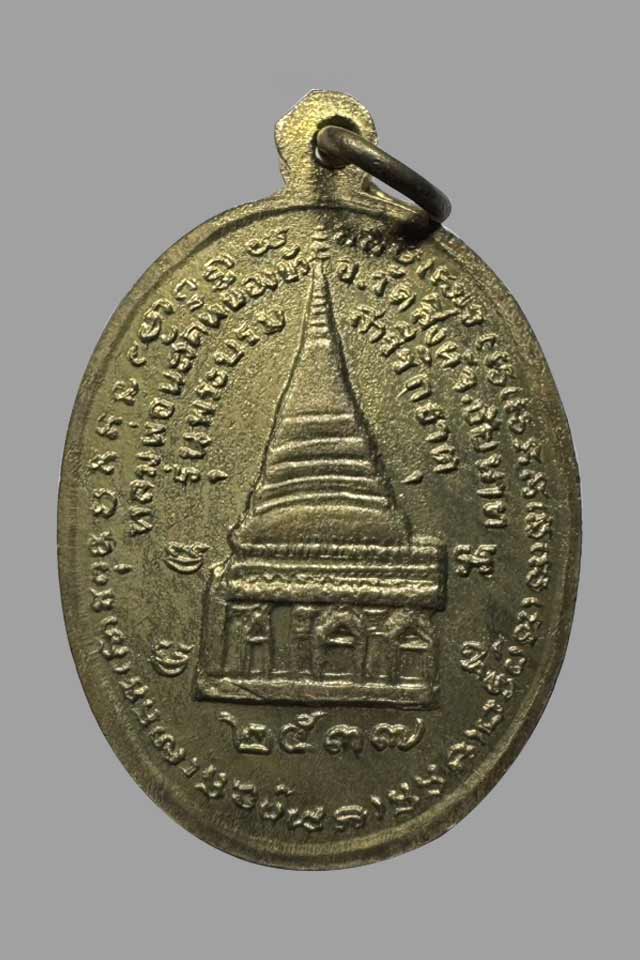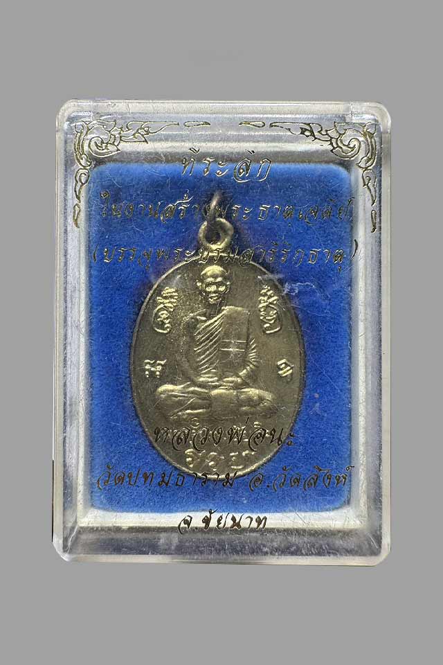 เหรียญพระครูปทุมชัยกิจ (หลวงพ่อนะ) วัดปทุมธาราม (วัดหนองบัว) จ.ชัยนาท รุ่นที่ระลึกในการสร้างพระธาตุเจดีย์ (บรรจุพระบรมสารีริกธาตุ) เนื้อทองฝาบาตร ปี 2537 |