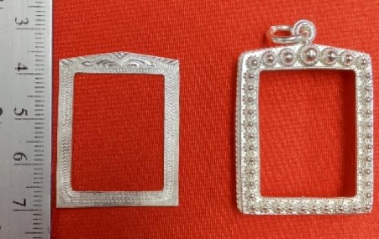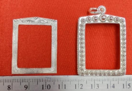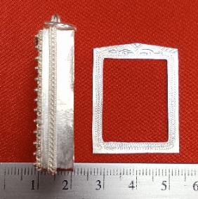 กรอบเงินสุโขทัย 96.5% ลายดอกพิกุล เนื้อหนา จอในกว้าง 2 ซม สูง 2.6 ซม. หนาเกือบ 1 ซม ทรงสำหรับพรหางหมากหลวงพ่อฤาษีหรือใกล้เคียง กรอบสั่งตัดสภาพใหม่ผมสั่งไว้แล้วไม่ได้ใช้ |