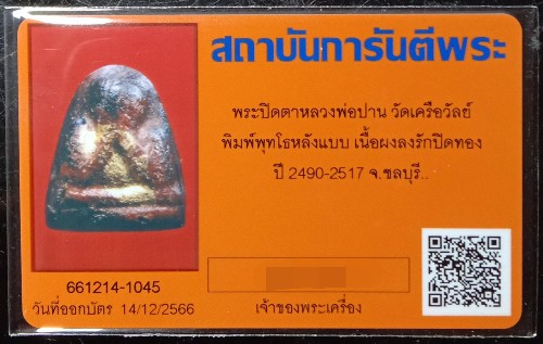 ปิดตาหลวงพ่อปาน วัเครือวัลย์ พิมพ์พุทโธหลังแบบ เนื้อผงลงรักปิดทอง พ.ศ.2490-2517