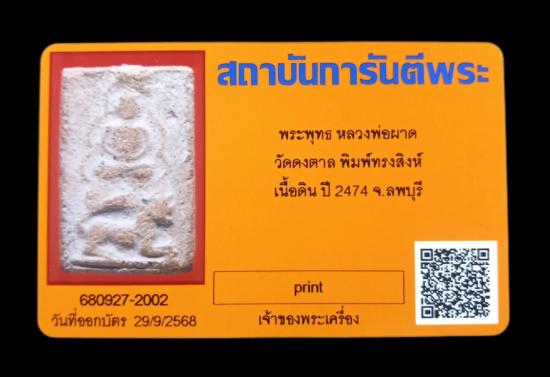 พระหลวงพ่อผาด วัดดงตาล พิมพ์ทรงสิงห์ ปี๒๔๗๔ (หลวงพ่อปาน ปลุกเสก) พร้อมบัตรรับรอง ครับ