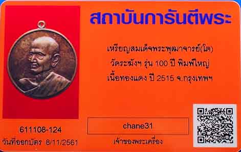 เหรียญสมเด็จวัดระฆัง รุ่น 100 ปี ( 22 มิถุนายน 2515 ) พิมพ์ใหญ่ 4.1 ซม. เนื้อทองแดง พร้อมบัตรรับรองสถาบันการันตีพระ