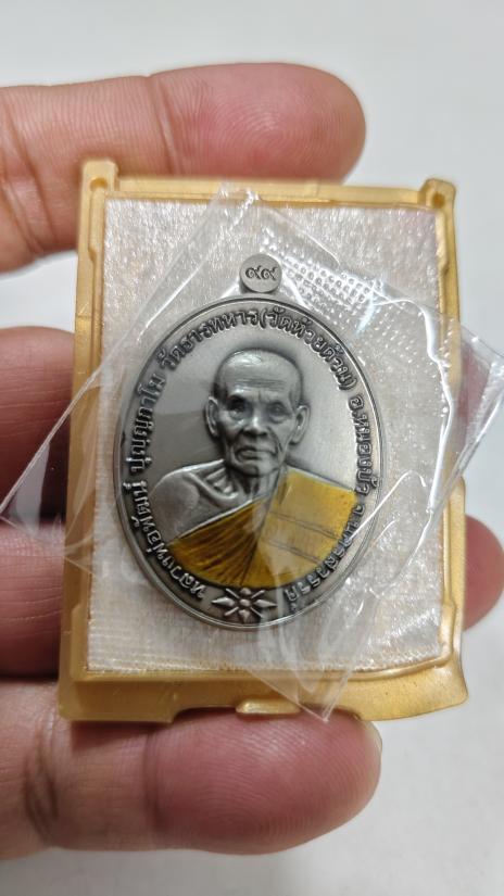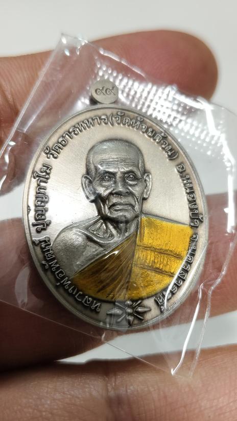 เหรียญรวยชนะจน 99 หลวงพ่อพัฒน์ ปุญญกาโม ออกวัดห้วยด้วน ปี 2563 ลงยาจีวรสีเหลือง ตอกโค๊ตหมายเลข 50 |