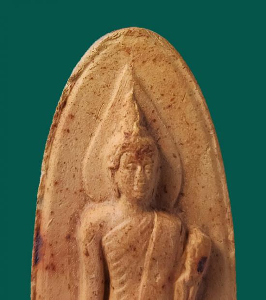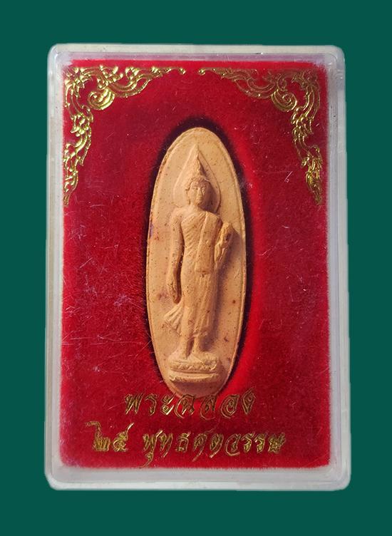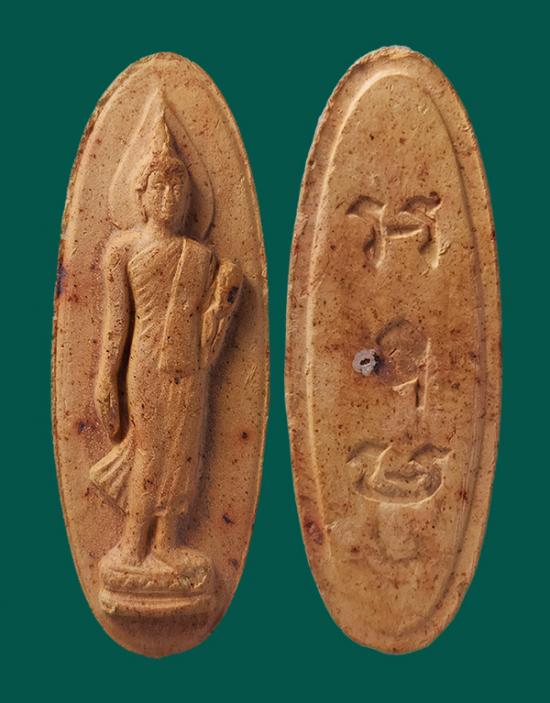 600.- พระลีลา 25 พุทธศตวรรษ ปี 2500 เนื้อดิน สีเหลืองเข้ม หน้าตาชัดเจน พร้อมกล่อง