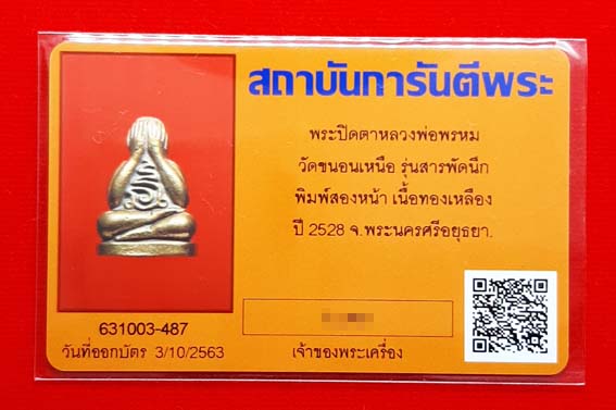 พระปิดตาสารพัดนึก หลวงพ่อพรหม เนื้อทองเหลือง ปี2528 วัดขนอนเหนือ จ.อยุธยา พร้อมบัตรรับรองครับ