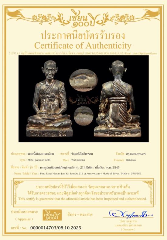 รูปเหมือนหล่อใหญ่วัดระฆัง ตั้งหน้ารถ 214 เนื้อเงิน |