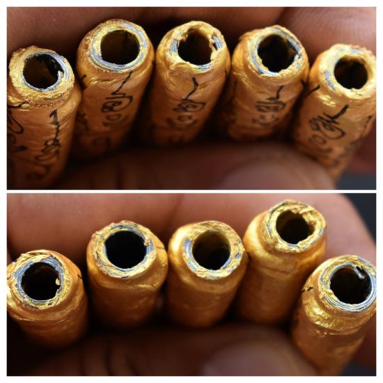 รายละเอียด ชุด 5 ดอก...ตะกรุดกาคาบทรัพย์ ปี 2554 หลวงปู่น้อย วัดบ่อหลวง จ.เพชรบุรี พร้อมซองเดิมจากวัด สภาพพระตามรูปทุกประการ ( ทาทองจารยันต์ ขนาดยาว 2 นิ้ว )