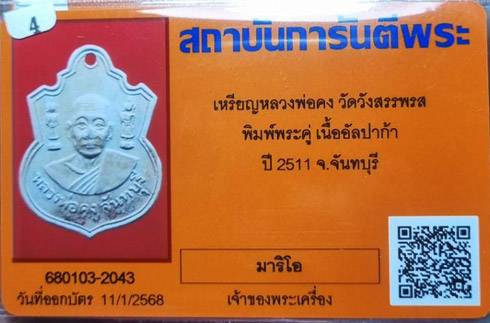 เหรียญหลวงพ่อคง วัดวังสรรพรส พิมพ์พระคู่ เนื้ออัลปาก้า ปี 2511 จ. จันทบุรี พร้อมบัตรรับรองพระแท้ แขวนได้สบายใจ พุทธคุณเต็มร้อยครับผม