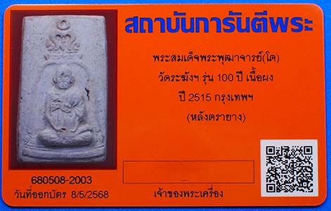 สมเด็จพระพุฒาจารย์ (โต) วัดระฆังฯ รุ่น 100 ปี พิมพ์รูปเหมือน เนื้อผง ปี 2515 จ.กรุงเทพฯ (หลังตรายาง) พร้อมกล่องเดิมและบัตรรับรองสถาบันการันตีพระ