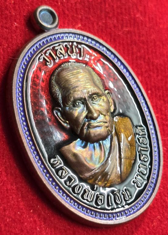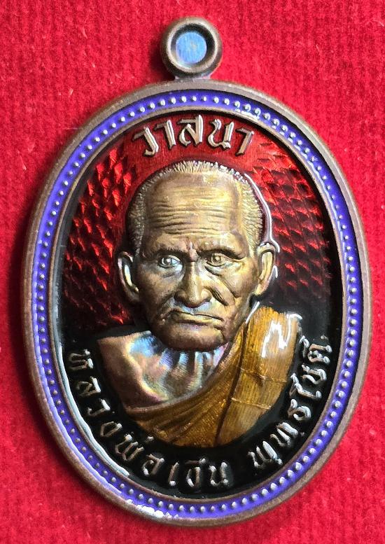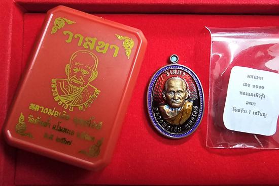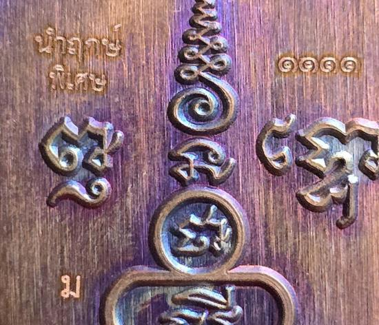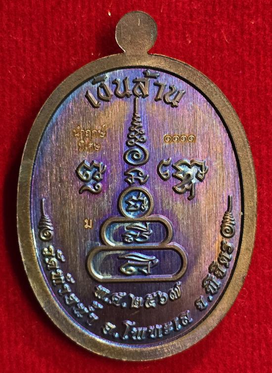 เนื้อทองแดงผิวรุ้ง ลงยาไล่สีดำแดง ขอบม่วง หมายเลข ๑๑๑๑....พร้อมกล่อง