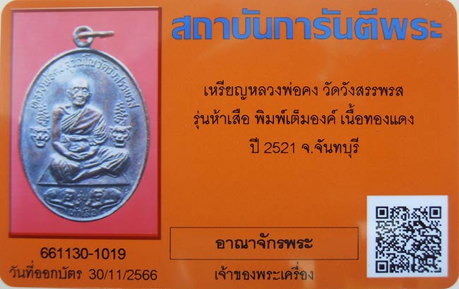 เหรียญหลวงพ่อคง วัดวังสรรพรส รุ่นห้าเสือ พิมพ์เต็มองค์ เนื้อทองแดง ปี 2521 พร้อมบ้ตรรับรอง