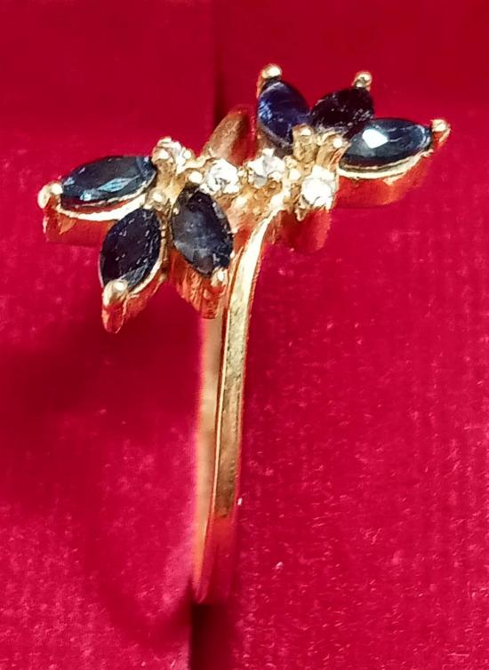 แหวนทองเหลืองขัดเงา หัวแหวนเป็นหนามเตยเกาะพลอยไพลินสีน้ำเงินเข้มเกือบดำ เพชรประดิษฐ์ ทรงดอกไม้สามกลีบไขว้ ไซซ์ประมาณ 57 วงนี้อายุหลายสิบปี สภาพตามรูป ราคาเบา ๆ ครับ แถมแหวนงานจิวเวอร์รี่ ไซซ์ประมาณ 54 ให้อีก 1 วง สุดคุ้ม ส่งฟรีทั่วไทย รับประกันตามกฎครับ