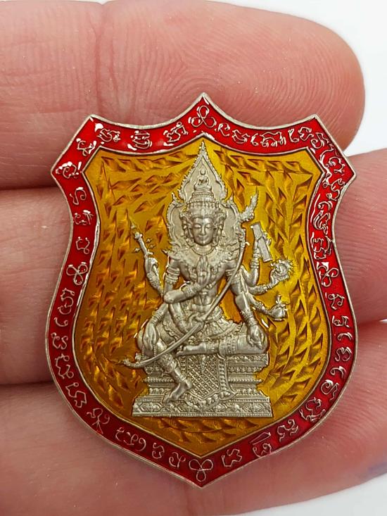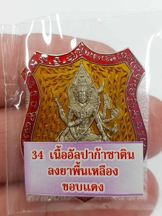 วัดใจเคาะเดียงแดง เหรียญท้าวมหาพรหม เจ้าสัวพันล้าน บอยท่าพระจันทร์ เนื้ออัลปาก้าซาตินลงยาพื้นเหลือง ขอบแดง |