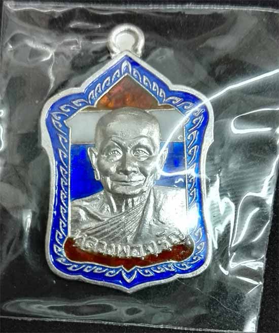 เหรียญหลวงพ่อจรัญ วัดอัมพวัน สิงห์บุรี พิมพ์เหรียญโล่ใหญ่ ครึ่งองค์ รุ่นมหามงลอายุครบ 7 รอบ เนื้อเงินลงยาธงชาติขอบสีน้ำเงิน พิมพ์ใหญ่