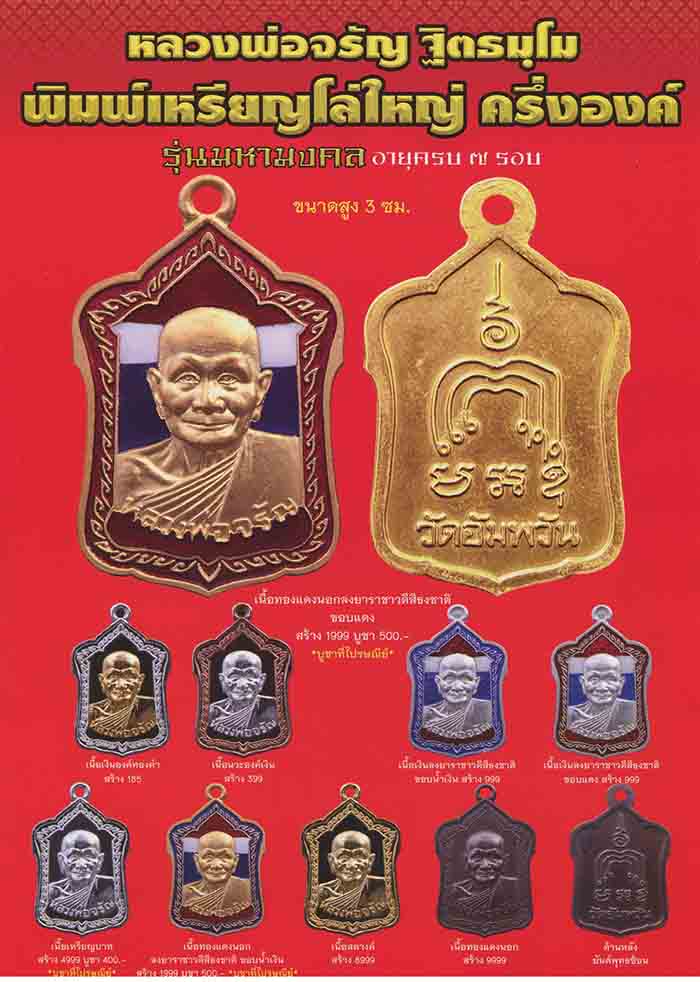 รายละเอียด เหรียญหลวงพ่อจรัญ วัดอัมพวัน สิงห์บุรี พิมพ์เหรียญโล่ใหญ่ ครึ่งองค์ รุ่นมหามงลอายุครบ 7 รอบ เนื้อเงินลงยาธงชาติขอบสีน้ำเงิน พิมพ์ใหญ่