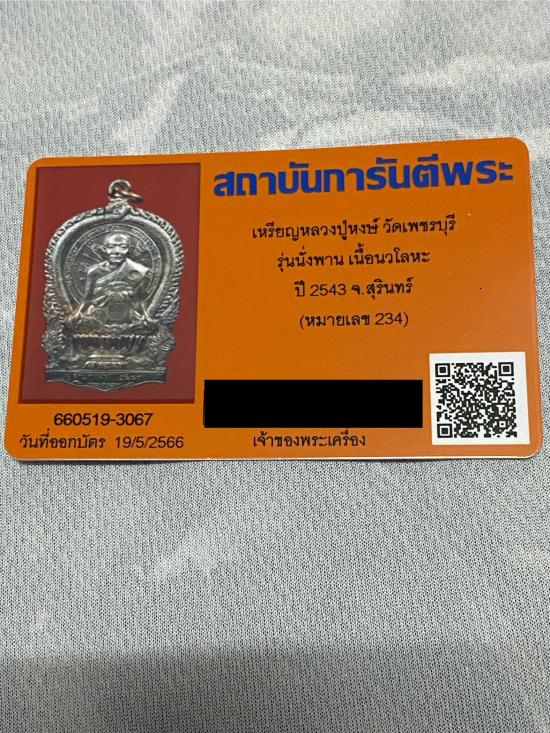 เหรียญหลวงปู่หงษ์ วัดเพชรบุรี รุ่นนั่งพาน เนื้อนวะโลหะ ปี2543 จ.สุรินทร์ เลขสวย234 พร้อมบัตรรับรองฯ โอนเงินแล้วแจ้งรายละเอียดการโอนทาง Mailbox ของเวปจี ได้รับแจ้งว่าโอนเงินแล้วจะส่งพระภายใน 3 วันทำการ
