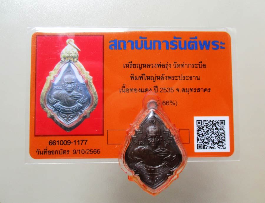 เหรียญหลวงพ่อรุ่ง วัดท่ากระบือ จ.สมุทรสาคร พ.ศ.2535 พิมพ์ใหญ่หลังพระประธาน เนื้อทองแดง พร้อมบัตรการันตีพระ !!