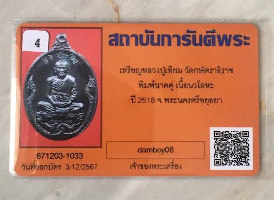 เหรียญนี้ที่นำมาเปิดประมูลจัดว่าเป็นเหรียญที่หายากมากๆ เพราะเนื้อนวโลหะตอกโค๊ดจัดสร้างเพียง 380 เหรียญ แต่เหรียญนี้พิเศษไม่ตอกโค๊ดและหูตัน และยังเป็นเนื้อนวโลหะอีกด้วย สภาพสวยสมบูรณ์เก็บเก่า สายตรงและท่านที่ชื่นชอบ เรียนเชิญครับ รับประกันความแท้ด้วยบัตรรับรองจากสถาบันการันตีพระ