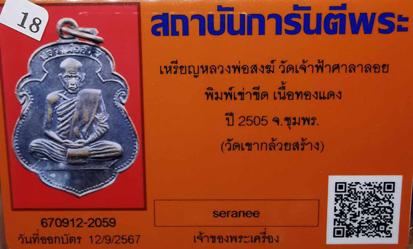 เหรียญหลวงพ่อสงฆ์ วัดเจ้าฟ้าศาลาลอย พิมพ์เข่าขีด เนื้อทองแดง ห่วงเดิม ปี2505 จ.ชุมพร(วัดเขากล้วยสร้าง)+ บัตรG-pra สภาพเดิมค่ะ สภาพตามรูปทุกประการค่ะ |