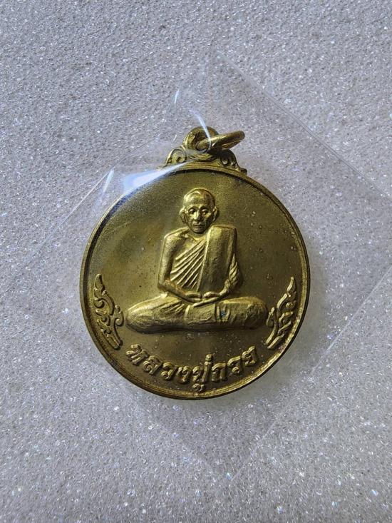 เหรียญกลมหลังยันต์ หลวงพ่อกวย ชุตินุธโร วัดโฆษิตาราม รุ่นฉลองเรือนไทย ปีพ.ศ.2553 เนื้อฝาบาตร น่าสะสม แดงไม่แรงครับ