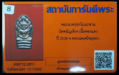เหรียญนาคปรกใบมะขาม เนื้อทองแดง ปี2538 วัดพนัญเชิง พระนครศรีอยุธยา