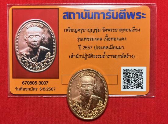เคาะเดียวแดง เหรียญครูบาบุญชุ่ม วัดพระธาตุดอนเรือง รุ่นเพชรมงคล เนื้อทองแดง ปี 2557 ประเทศเมียนมา. |