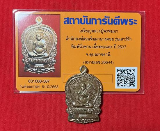 เคาะเดียวแดง เหรียญหลวงปู่พรหมมา สำนักสงฆ์สวนหินผานางคอย รุ่นเสาร์ห้า พิมพ์นั่งพาน เนื้อทองแดง ปี 2537